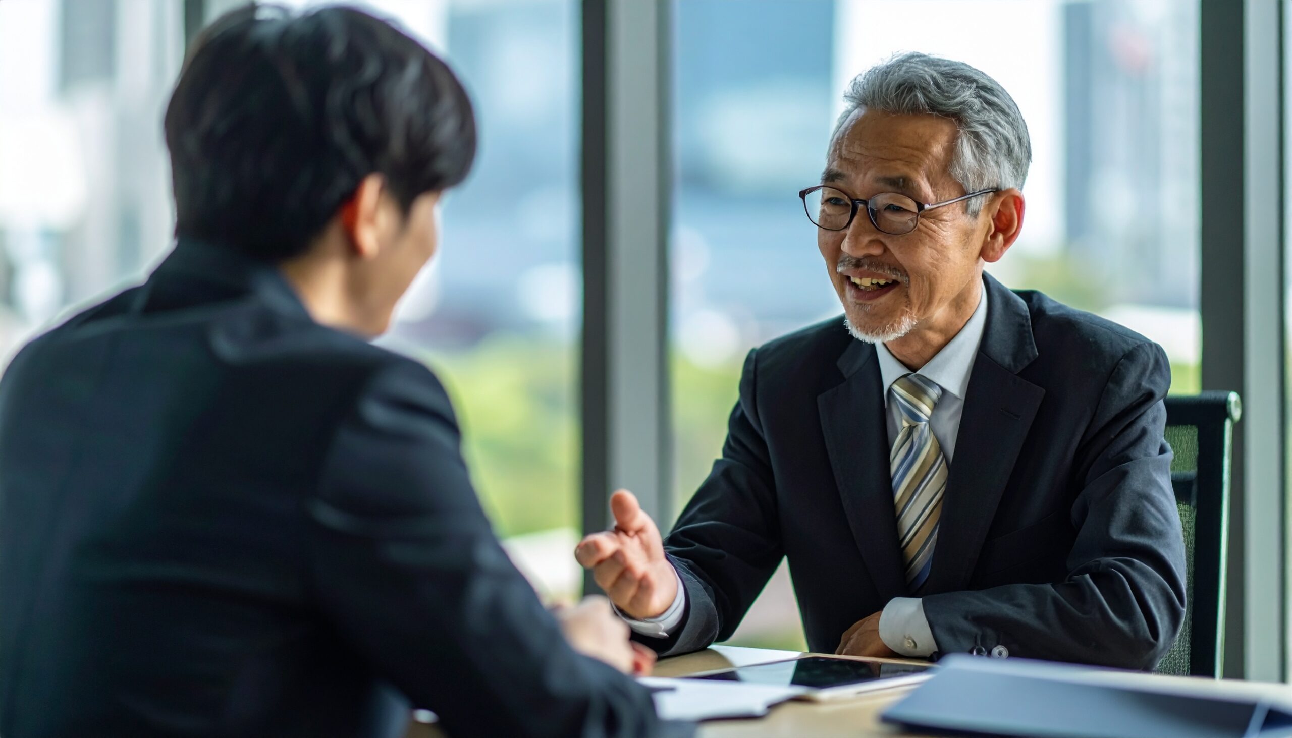 Firefly_日本人シニアが相手と交渉するビジネスシーン 386426